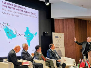 Dans un premier temps, Gérard Mestrallet a rappelé la genèse et l’ambition de l’IMEC (India–Middle East–Europe Corridor) : un corridor économique et logistique reliant l’Inde, le Golfe et l’Europe grâce à des infrastructures portuaires, ferroviaires, numériques et énergétiques.