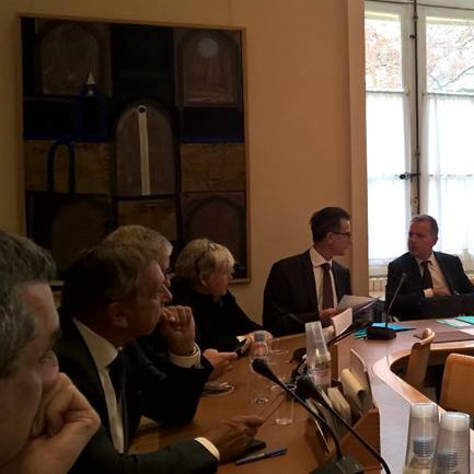 Réunion du groupe UDI-UC avant le départ des sénateurs pour Versailles. Le président François Zocchetto nous informe des discussions du week-end avec le Président de la République en réaction aux évènements tragiques de vendredi soir à Paris.