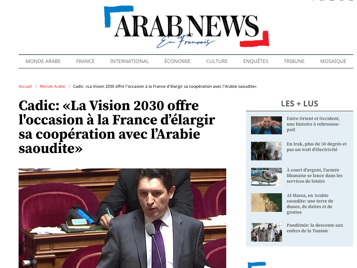 J’ai répondu aux questions d’Arab News en qualité de président du groupe d’amitié interparlementaire France-Pays du Golfe du Sénat. L’article publié ce 14 juillet est centré sur la coopération entre la France et l’Arabie saoudite, pays où je me suis rendu deux fois dans le cadre de mon mandat : la première fois, à Djeddah en 2015, puis à Riyad, en avril 2019.