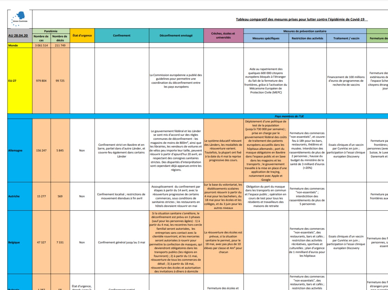 Tableau comparatif, réalisé par le groupe Union centriste du Sénat, de la situation sanitaire dans l’Union européenne et le G7 (nombre de malades, décès…) et des mesures prises par chaque pays : état d’urgence, confinement, maintien des activités, crèches-écoles-universités, mesures institutionnelles (frontières, vie démocratique), mesures de soutien économique…