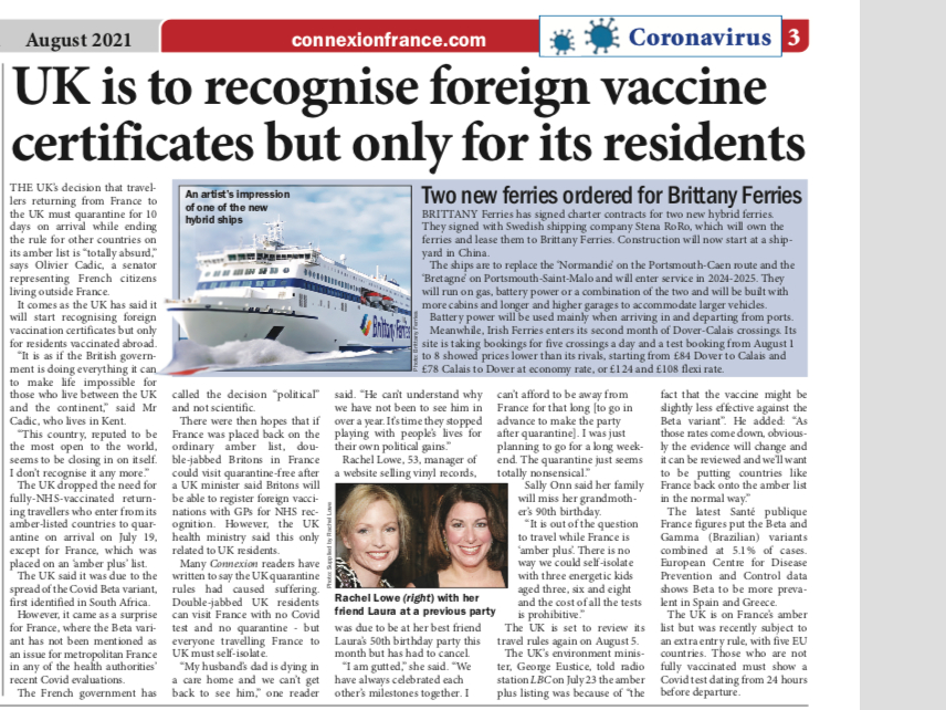 J’ai déclaré à The Connexion que je trouvais totalement absurde cette disposition imposant une quarantaine de 10 jours pour des personnes venant de France vaccinées et testées. J’ai ajouté que c’était à croire que le gouvernement britannique faisait tout ce qu’il pouvait pour rendre la vie impossible à ceux qui vivent à cheval entre le Royaume-Uni et le continent, dont je fais partie.