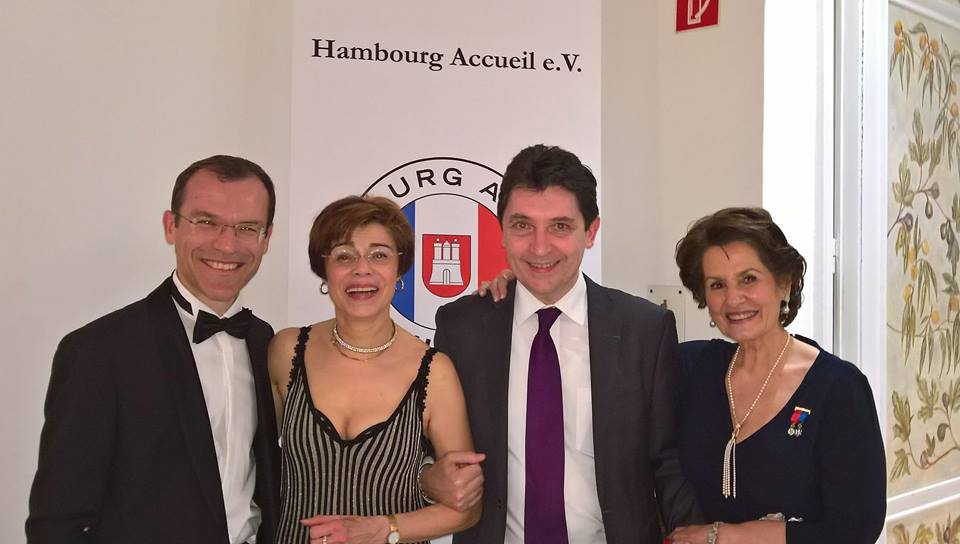 (à l’image) Gala de bienfaisance de l’association Hambourg Accueil. (g. à d.) Laurent Toulouse, consul général ; Marie-Christine Leneveu, présidente ; Olivier Cadic ; Marie-Christine Kliess, conseillère consulaire pour Berlin-Hambourg
