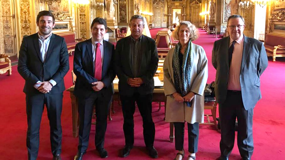 (g. à d) Thibault Dufresne (Centre Charles Péguy) ; Olivier Cadic ; Guillaume Dufresne (DG du groupe CEI) ; Annie Gauvin et Jean-Christophe Bonnin, responsables de Pôle Emploi International.