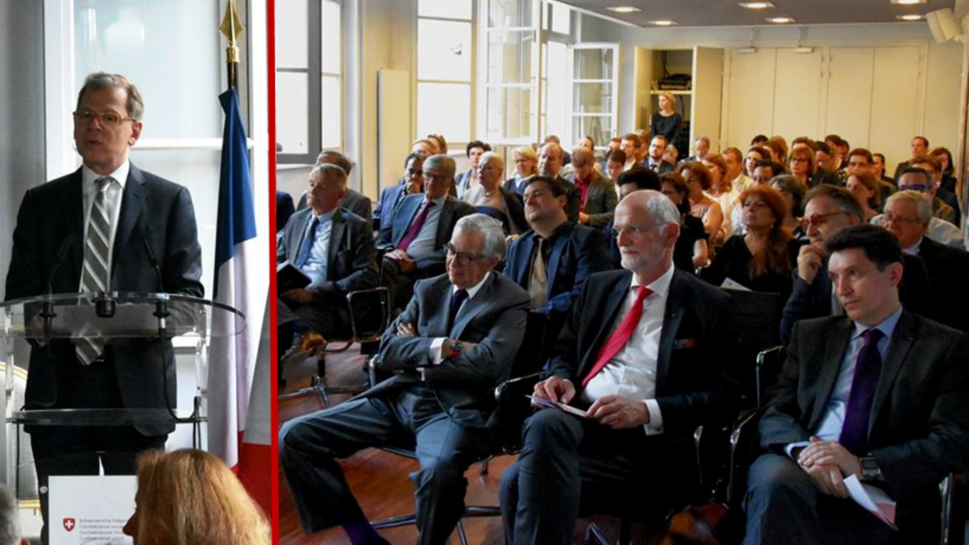 (g. à d.) Bernardino Regazzoni, ambassadeur de Suisse en France, introduisant le débat ; Metin Arditi, écrivain suisse ; Jean-Frédéric Jauslin, ambassadeur de Suisse auprès de l’Unesco et de la Francophonie ; Olivier Cadic.