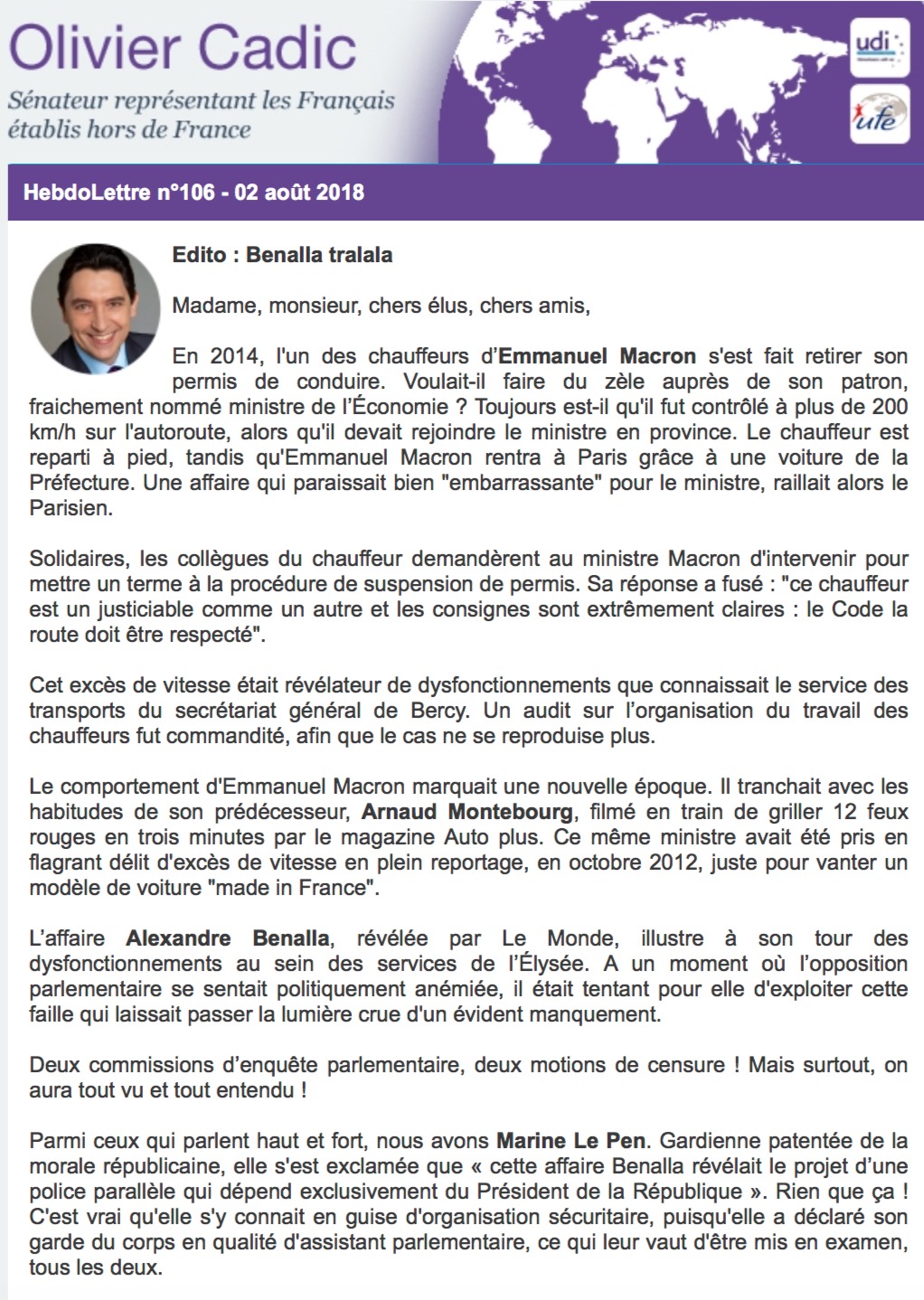 Parmi ceux qui parlent haut et fort, nous avons Marine Le Pen. Gardienne patentée de la morale républicaine, elle s’est exclamée que ” cette affaire Benalla révélait le projet d’une police parallèle qui dépend exclusivement du Président de la République “. Rien que ça ! C’est vrai qu’elle s’y connait en guise d’organisation sécuritaire, puisqu’elle a déclaré son garde du corps en qualité d’assistant parlementaire, ce qui leur vaut d’être mis en examen, tous les deux.Autre saillie drolatique de la reine héritière du FN : le fonctionnement de la commission d’enquête de l’Assemblée nationale, présidée par LREM, lui donne l’impression d’être en Corée du Nord. Faux. La Corée du Nord est bien mieux disciplinée : personne ne dépose de motion pour censurer Kim Yong Un. On gagne du temps.