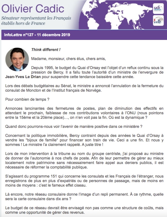 Lors des débats budgétaires au Sénat, le ministre a annoncé l’annulation de la fermeture du consulat de Moncton et de l’Institut français de Norvège.