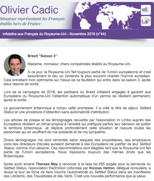 Après avoir amené Theresa May à renoncer à la taxe de £65 exigée pour la demande du Settled Status, l’association the3million cofondée par Nicolas Hatton, délégué consulaire, a réussi le tour de force de faire inscrire l’automaticité du Settled Status dans les manifestos des LibDems, des Travaillistes et des Verts. C’est une nouvelle performance que je salue.