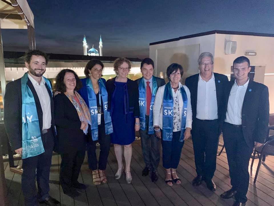 La délégation française à Kazan (g à d) : Victor Simon (ancien champion) ; Sylvie Bermann, ambassadeur de France en Russie ; Catherine Fabre, députée de Gironde ; Muriel Pénicaud, ministre du Travail ; Olivier Cadic ; Élisabeth Lamure, pdte de la Délégation sénatoriale aux Entreprises ; Michel Guisemberg, président de WorldSkills France ; Victor Simon (ancien champion).