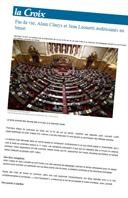 Article dans La Croix : « Fin de vie, Alain Claeys et Jean Leonetti auditionnés au Sénat », du 15 avril 2015