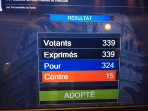 Je remercie mes collègues sénateurs pour avoir adopté la proposition de résolution (PPR) dont je suis l’auteur, destinée à renforcer les sanctions à l’encontre des responsables des violations des droits humains au Venezuela (*). Un résultat sans ambiguité : 324 voix Pour ; 15 voix Contre.
