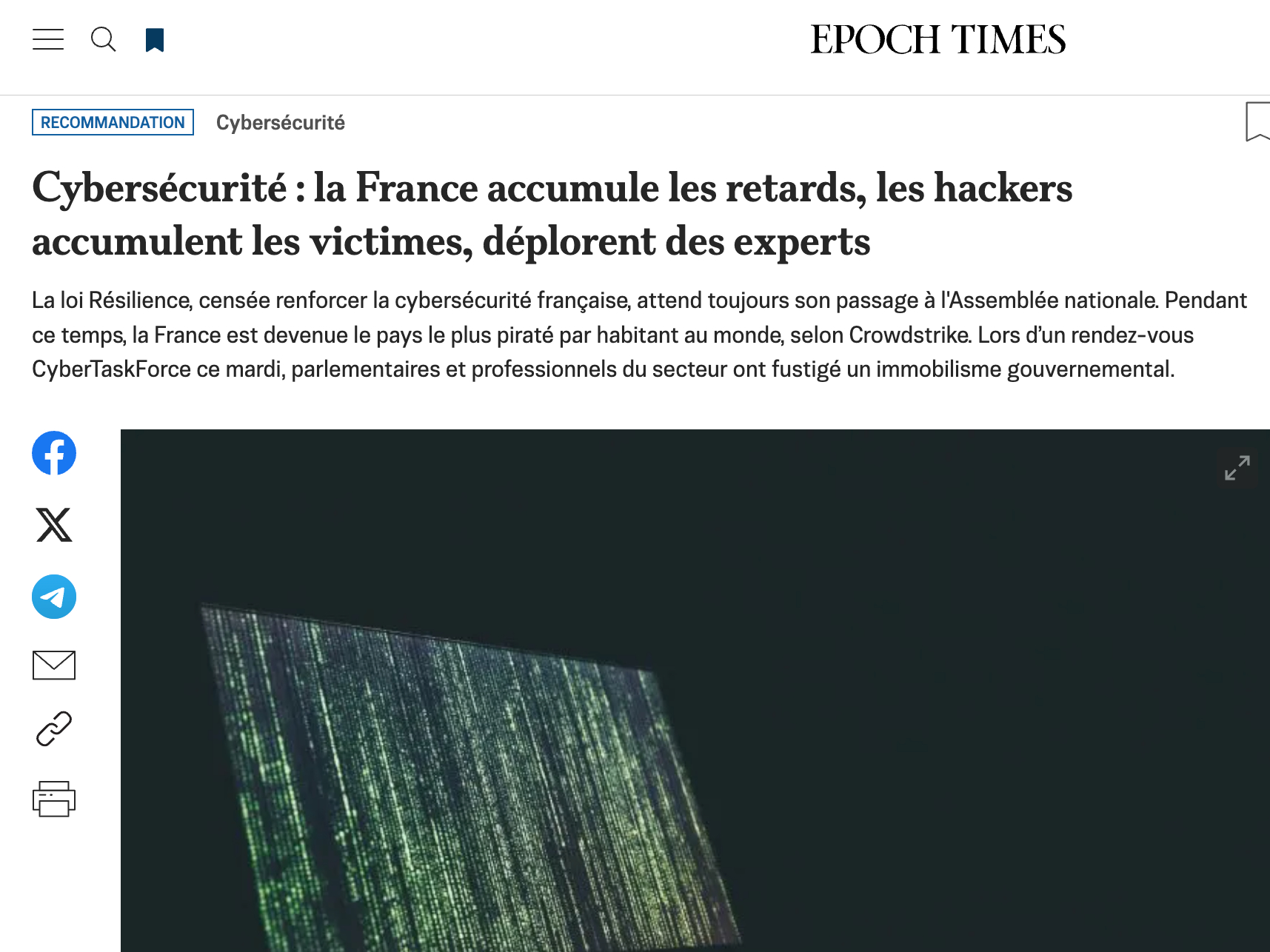Lire l’article Cybersécurité : la France accumule les retards, les hackers accumulent les victimes, déplorent des experts sur le site Epoch Times