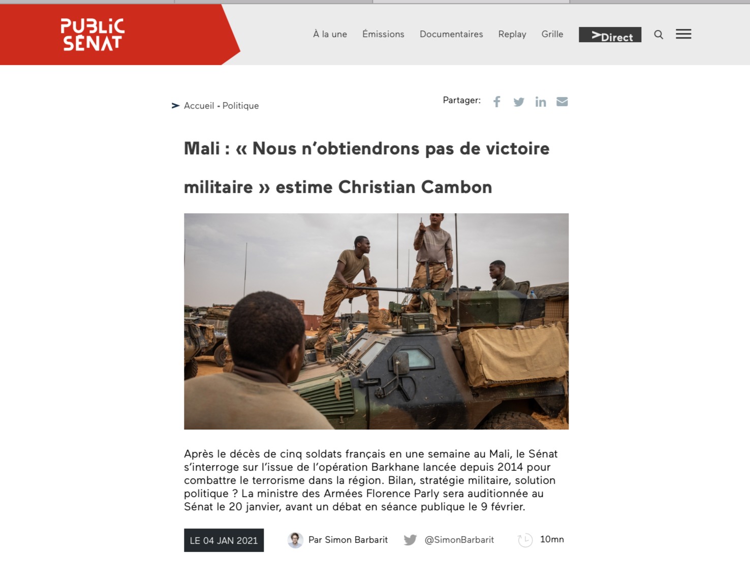 Lire l’article de Public Sénat (4 janv. 2021) : «Nous n’obtiendrons pas de victoire militaire» estime Christian Cambon