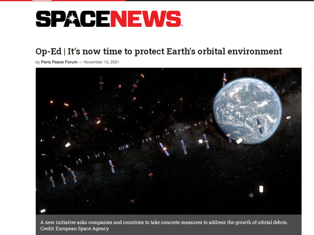 Le 12 novembre 2021, à l’occasion de la quatrième édition du Forum de Paris sur la Paix, des acteurs du monde entier, concernés par la détérioration rapide de l’environnement orbital terrestre, ont lancé l’initiative « Net Zero Space », qui appelle à garantir une utilisation durable de l’espace d’ici 2030 en adoptant d’urgence des mesures visant à réduire le nombre de débris spatiaux.