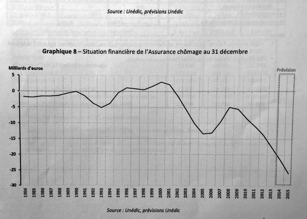 Comme on dit, un bon dessin vaut mieux qu’un long discours. Voici un graphique qui présente la situation financière de l’Assurance chômage entre 1984 et 2015.