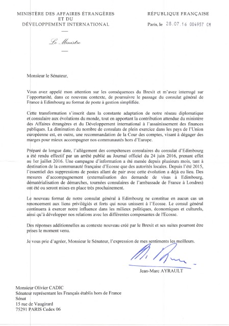 Au lendemain du référendum britannique, j’avais adressé un courrier à Jean-Marc Ayrault, ministre des Affaires étrangères et du Développement international, pour lui demander de surseoir au transfert vers Londres des services du consulat d’Edimbourg.