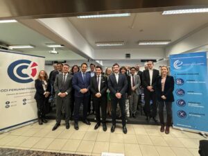 Réunion avec la section des CCEF Pérou, présidée par Antoine Bidault (EiffageGC Marine), avec la participation de Silmara de Assis e Silva (Egis), Bastien Roux (Bureau Veritas Group) et El Medhi Ben Maalla (Engie), en présence de Vincent Sicet, CFDE Pérou, Jean-Philippe Gavois, premier conseiller de l’ambassade de France, et Florence Gonzalez, responsable du service économique.