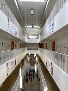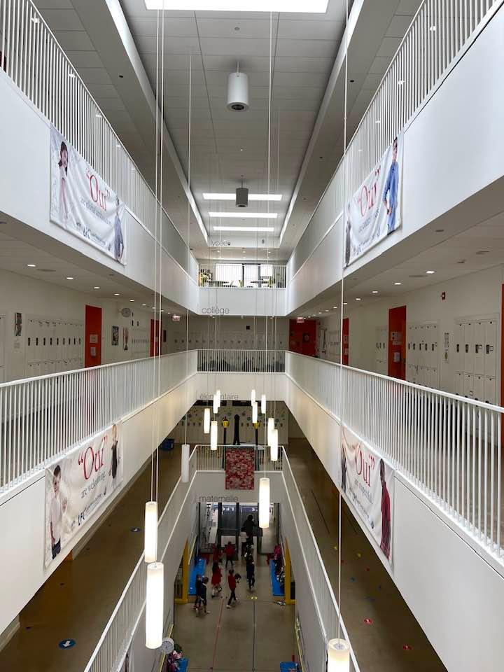Le majestueux atrium, à l’intérieur du bâtiment, crée une connexion visuelle et physique entre les différents niveaux, entre les élèves, entre les enseignants et avec l’administration.