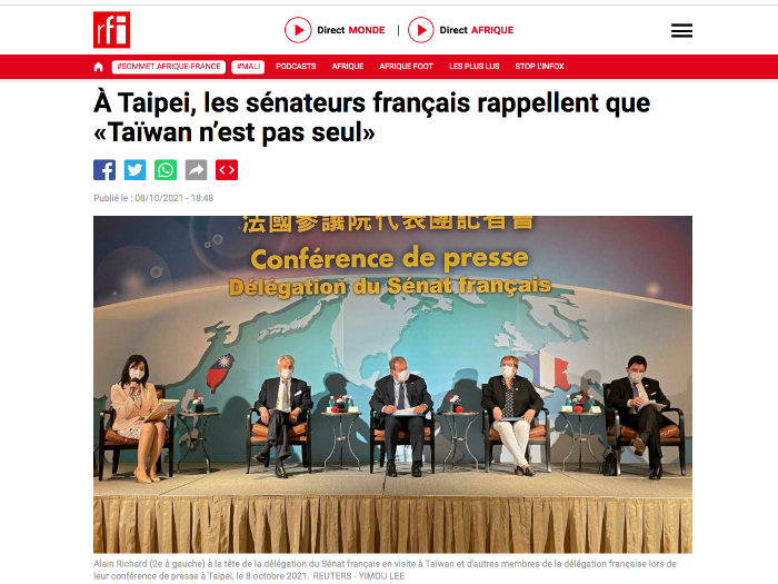 Source Rfi : À Taipei, les sénateurs français rappellent que «Taïwan n’est pas seul» (08.10.2021)