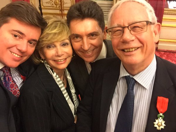 19.00 Sénat. Remise de décoration à Christian Cointat, ancien sénateur représentant les Français établis hors de France. Christian avait fait le choix de ne pas se représenter en 2014 pour favoriser le renouvellement. Je lui dois tant. Avec mes colistiers Christophe Frassa et Jacky Deromedi, nous lui témoignons notre reconnaissance pour son engagement et le résultat de son action. Christian Cointat compare le ruban rouge de la Légion d’honneur au baiser républicain de Marianne.