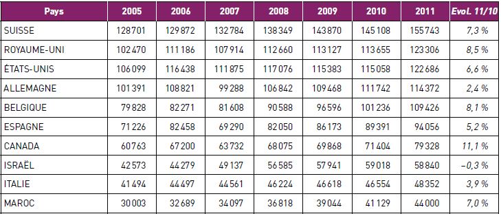 – l’Australie qui réalise un taux spectaculaire de 15,8% et qui comptabilise aujourd’hui 18.323 Français, contre 15.821 en 2011,