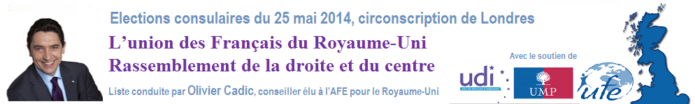 Le 25 mai prochain (*), vous serez appelés à élire 9 conseillers consulaires. Ils succèderont à vos 6 conseillers à l’AFE. Notre liste « L’union des Français du Royaume-Uni, rassemblement de la droite et du centre » soutenue par l’UMP, l’UDI et l’UFE a pour ambition de faire de la circonscription de Londres un exemple d’amélioration du service public pour les Français vivant hors de France. Nous vous présentons aujourd’hui la première partie de notre projet consacrée à l’administration consulaire, à l’emploi et au développement de nos entreprises au Royaume-Uni. Administration consulaire : Avec Annie Burnside, consule honoraire de Bristol et élue à l’AFE à mes côtés, nous avons pris en compte vos attentes en matière de service consulaires tout au long de notre mandat. Forte de cette expérience, notre liste propose de lancer un plan Consulat sur le modèle du plan École, car nous pensons que l’administration ne doit plus décider seule de ce qui est bon pour vous. Emploi : Notre liste propose d’aider nos entreprises et l’emploi des jeunes autour de 5 priorités que vous découvrirez ci-dessous. Entreprises françaises au Royaume-Uni : Nous connaissons bien les problématiques : un quart de notre liste est constitué de chefs d’entreprises à la tête de PME au Royaume-Uni. Certains d’entre nous sont membres de la Chambre de commerce française en GB (CCFGB) et Stéphane Rambosson est également conseiller du commerce extérieur. Avec Loic Dumas, nous avons été les initiateurs des Apéros Entrepreneurs à Londres et de l’UFE Corporate. Arnaud Vaissié, président et fondateur d’International SOS et ancien président de la CCFGB nous fait l’honneur de présider notre comité de soutien. Si vous souhaitez vous aussi encourager notre action, vous pouvez nous envoyer un message à soutienconsulaires@oliviercadic.com. Durant cette campagne, les membres de notre liste iront à votre rencontre ! Du vendredi 25 avril au dimanche 27 avril 2014, nous serons à Jersey et Guernesey pour évoquer les difficultés particulières de nos compatriotes situés dans les iles anglo-normandes. Pour nous contacter, merci d'adresser votre courriel à consulaires@oliviercadic.com. Très cordialement, Olivier Cadic