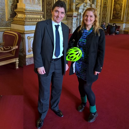Une Californienne au Sénat, Gabrielle Durana, son casque de biker sous le bras. Elle préside l’Efba qui propose des cours de français à des élèves de 5 à 18 ans, en "after school" dans les écoles de la région de San Francisco.