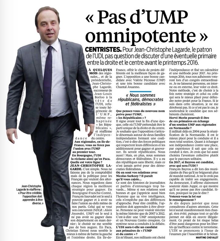 Le président de l’UDI, répond aux questions de Martine Chevalet dans Le Parisien du 28 avril 2015. Il évoque la stratégie du parti centriste à quelques mois des régionales et aborde la question des primaires.