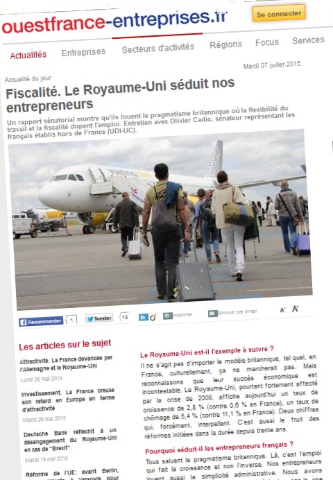 Article dans Ouest-France : «Fiscalité. Le Royaume-Uni séduit nos entrepreneurs» du 07 juillet 2015 :