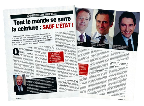 Dans le numéro d’avril 2015 de la revue Entreprendre, je suis interrogé par Pascal Rosier dans un article consacré à la dette publique. Dans ce dossier, à noter « Les 15 mesures choc pour s’en sortir » par Agnès Verdier-Molinié (fondation iFrap).