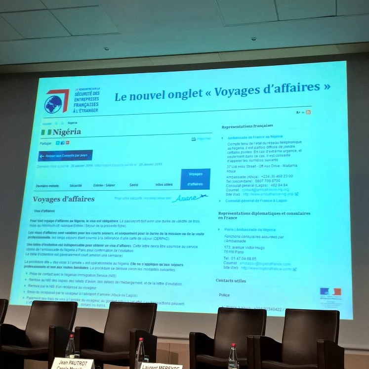 Les 10èmes Rencontres sur la sécurité des entreprises françaises à l’étranger au ministère des Affaires étrangères du 21 janvier dernier ont été l’occasion d’annoncer un nouvel onglet conseils aux “voyageurs d’affaires” sur la page “conseils aux voyageurs” pour compléter le dispositif d’information et d’alerte. Il n’échappe à personne que les déplacements d’affaires obéissent à des impératifs différents de ceux des voyages d’agrément, comme les délais et les modalités d’obtention des visas.