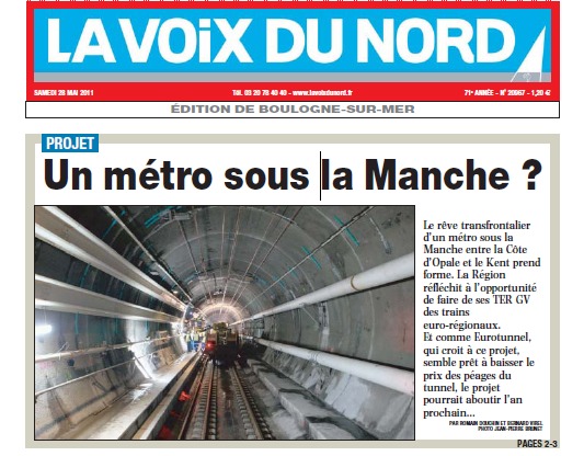 J’ai souligné à Boulogne sur Mer que la volonté des élus et des acteurs économiques n’avait pas faibli et que le bien-fondé du projet n’avait fait que se renforcer. Mais le temps a filé ! Il y a deux ans déjà, les médias s’emparaient avec enthousiasme du dossier, pour ne citer que la Voix du Nord (« Le métro Transmanche sur de bons rails ? », le 14 décembre 2011) et France 3 (lire : “Le métro transmanche s’invite sur France 3” du 23 novembre 2011).