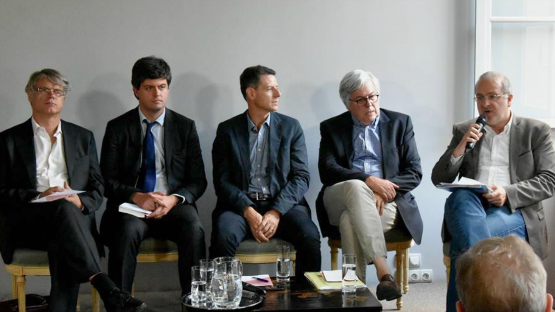 (g. à d.) Guillaume Poitrinal, ancien co-président du Conseil de simplification ; Olivier Peyrat, directeur général de l’Association française de normalisation ; Sophie Vermeille, fondatrice et présidente de Droit et Croissance ; Jean-Ludovic Silicani, ancien Commissaire à la réforme de l’État ; Gaspard Koenig, président du think tank Génération Libre