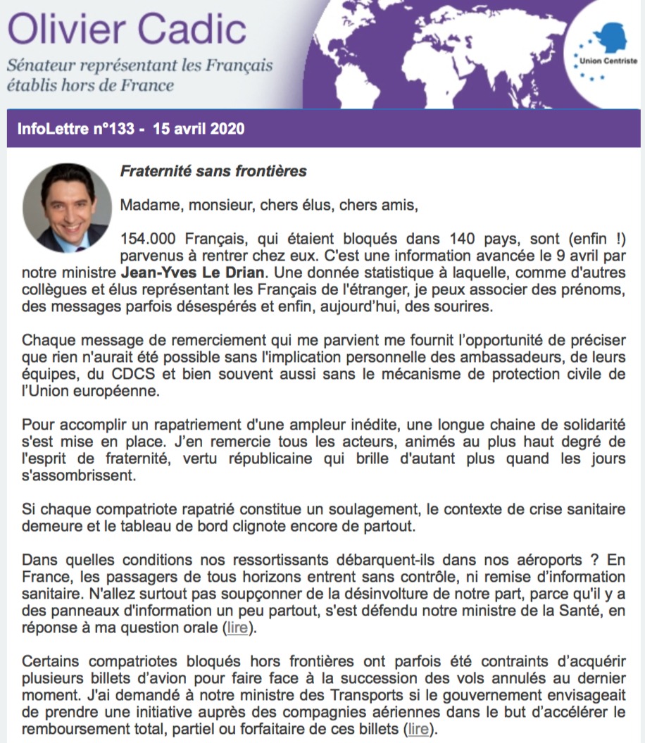 INFOLETTRE n°133 – Édito : “Fraternité sans frontières” // Français de l’étranger : point hebdo avec JB Lemoyne (2 & 9 avril) // Enseignement français à l’étranger : conférence du ministère (7 avril) // Note du Sénat sur le rapatriement des Français bloqués // Olivier Véran répond sur les mesures de précaution dans les aéroports // QE sur le remboursement des vols annulés // Comment améliorer le système d’enregistrement des FE ? // Coronavirus : point de situation en Europe et G7 // La CFE lance son offre Covid.19ExpatSanté // L’OMS doit pleinement collaborer avec Taiwan (tribune) & Remerciements officiels de Taiwan // En circonscription en TUNISIE : Tunis et Sousse (12-14 fév. 2020) / KENYA : Nairobi (20-21 fév. 2020) / ÉGYPTE – Le Caire & Alexandrie (23-24 fév. 2020) / EAU – Abou Dhabi & Dubaï (26-27 fév. 2020).