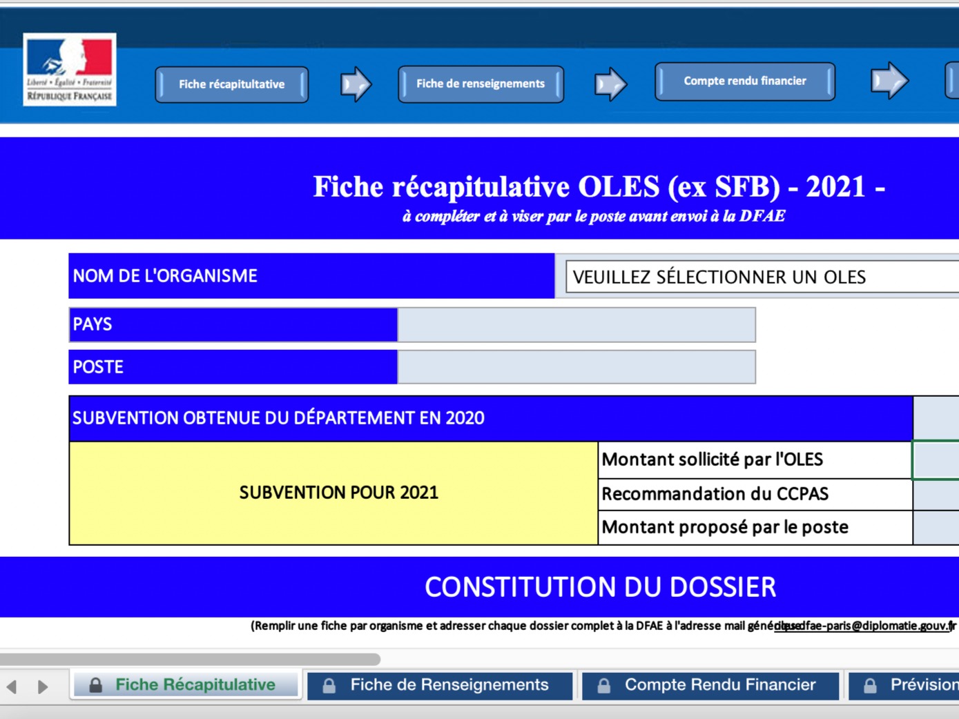 Le formulaire de demande de subvention est paramétré, pour le moment, avec les OLES connus par les différents postes consulaires. Cette liste peut être élargie avec vos postes consulaires respectifs en lien avec la DFAE.
