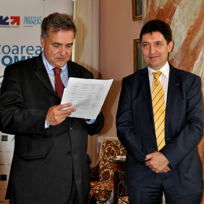 Afin de mettre en valeur les excellents résultats de l’enseignement français et du français en Roumanie, à la faveur de ma venue, Laurence Auer, ambassadrice de France, a organisé un diner à la Résidence sur le thème de la coopération éducative, avec Sorin Cîmpeanu, ministre de l’Éducation, Radu Szekely, secrétaire d’état à l’Égalité des chances pour le ministère de l’Éducation et conseiller du ministre, Julien Chiappone-Lucchesi, COCAC et directeur de l’IF, Michaël Koriche, attaché de coopération éducative, Christophe Carton, expert technique international.