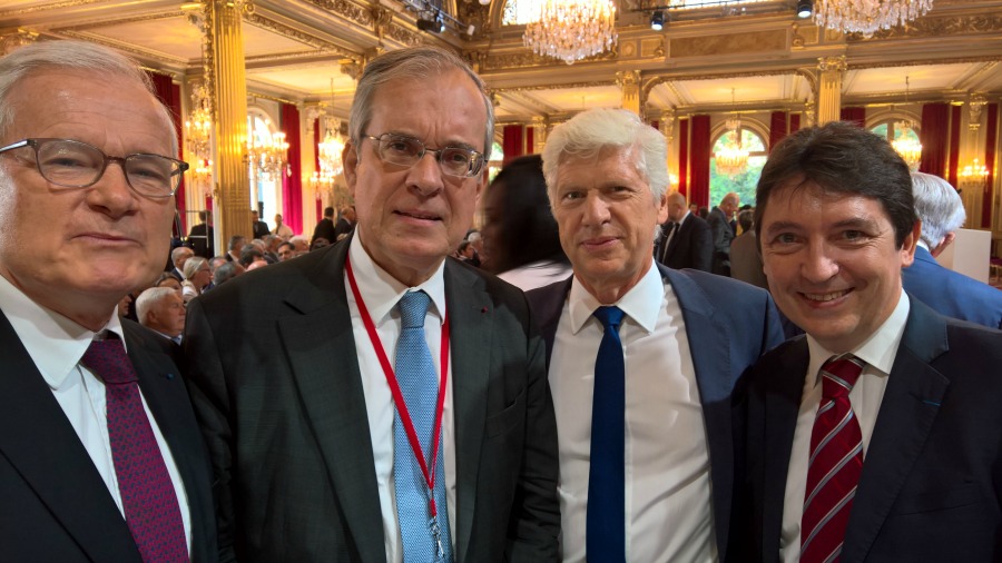 (g. à d.) Bernard Emié, directeur de la DGSE et ambassadeur de France au Royaume-Uni de 2011 à 2014 ; Maurice Gourdault-Montagne, secrétaire général du ministère de l’Europe et des Affaires étrangères et ambassadeur de France au Royaume-Uni de 2007 à 2011 ; Arnaud Vaissié, président de la CCI France International et Olivier Cadic.