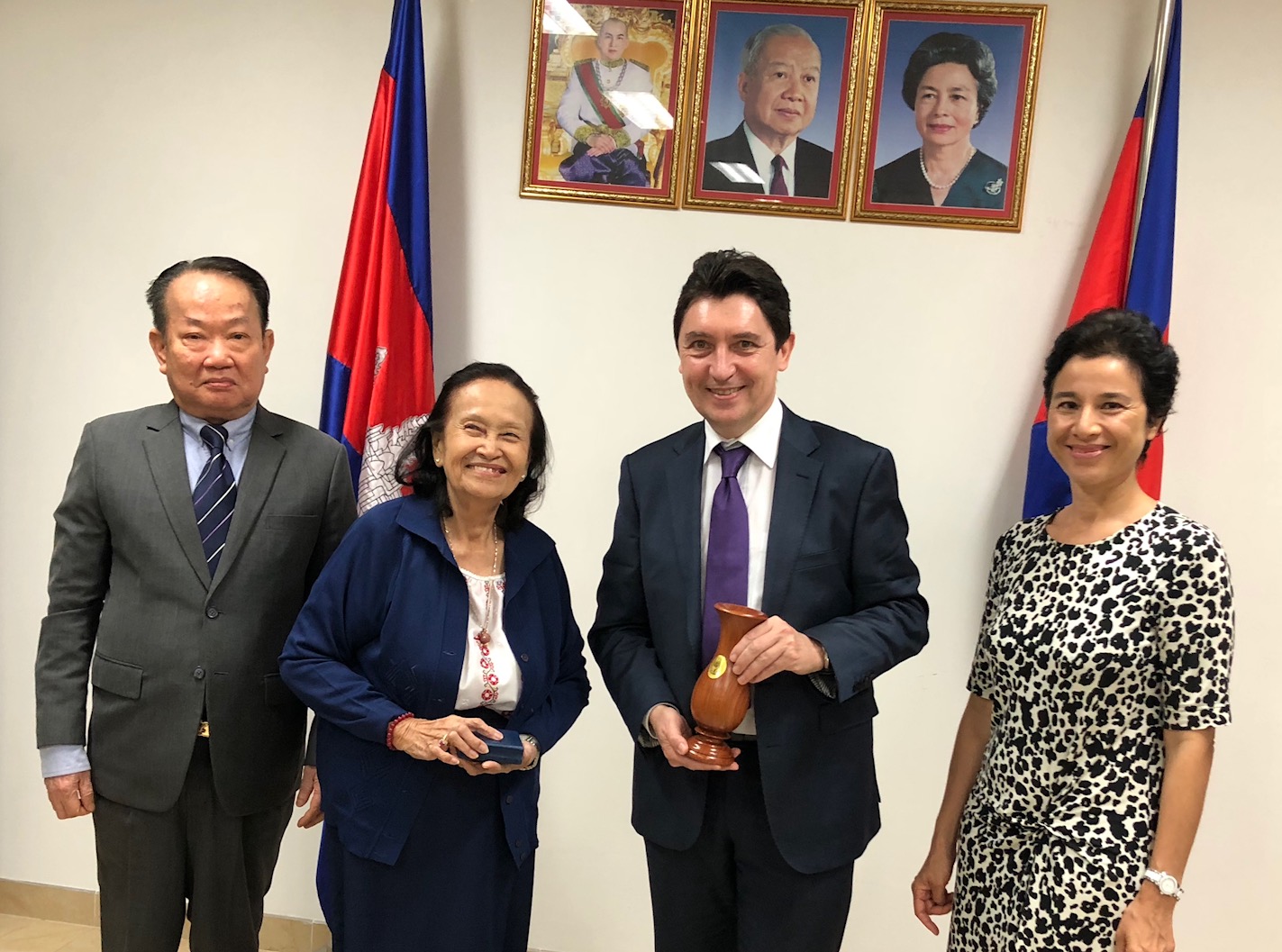 (g à d) Oum Sarith, secrétaire général du Sénat ; T’y Borasy, pdte de la commission des Affaires étrangères et de la Coopération internationale, pdte du groupe d’amitié Cambodge-France ; Olivier Cadic ; Eva Nguyen Binh, ambassadrice de France.