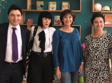 (g à d) Olivier Cadic ; Chantal Thomass, marraine officielle de l’association ; Tina Kieffer, présidente-fondatrice de Toutes à l’école ; Eva Nguyen Binh, ambassadrice de France au Cambodge.