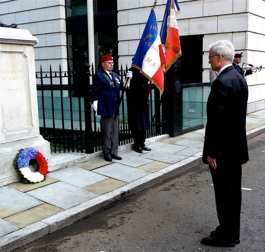 Cérémonie organisée par la mission de Défense de l’ambassade de France devant la statue du général. Discours de Bernard Emié, ambassadeur de France au Royaume-Uni.