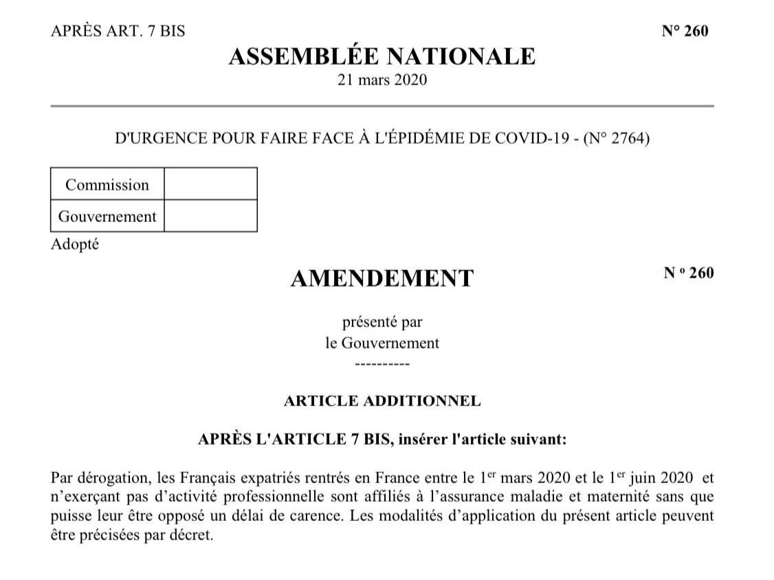 Les Français expatriés rentrés en France entre le 1er mars et le 1er juin et n’exerçant pas d’activité professionnelle sont affiliés à l’Assurance maladie et maternité sans que leur soit opposé le délai de carence.