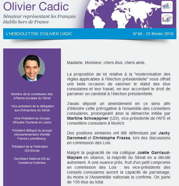 Des positions similaires ont été défendues par Jacky Deromedi et Christophe Frassa, lors des discussions en commission des Lois.Malgré la pugnacité de ma collègue Joëlle Garriaud-Maylam en séance, la majorité du Sénat en a décidé autrement. A une nuance près, fruit d’un petit compromis en commission des Lois : les vice-présidents des conseils consulaires auront la capacité de parrainage, du moins si l’Assemblée nationale le confirme. On parle de 130 élus au total. Lire la suite et découvrir l’HebdoLettre n°49