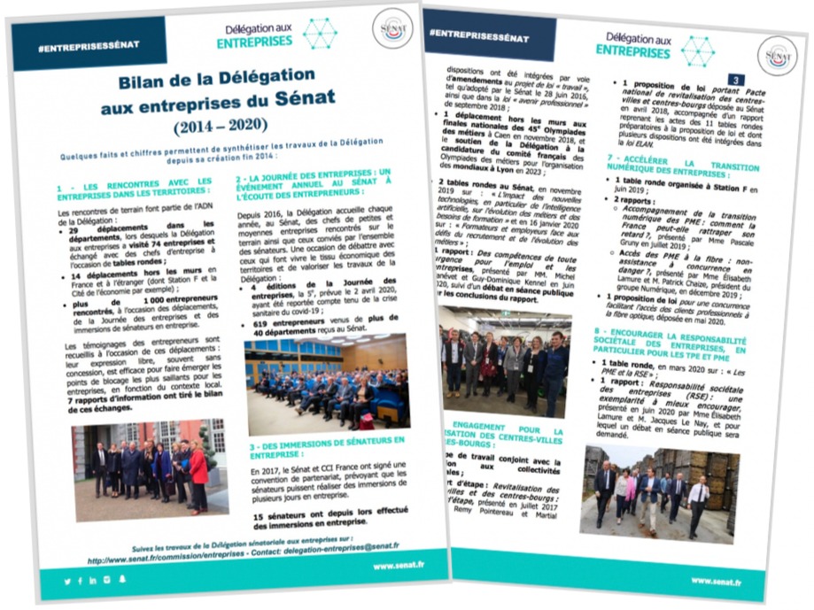 Sous la présidence d’Élisabeth Lamure, les 42 sénateurs de la DSAE ont produit un travail remarquable, qui vient d’être synthétisé en 4 pages : Bilan de la Délégation aux entreprises du Sénat (2014 – 2020).