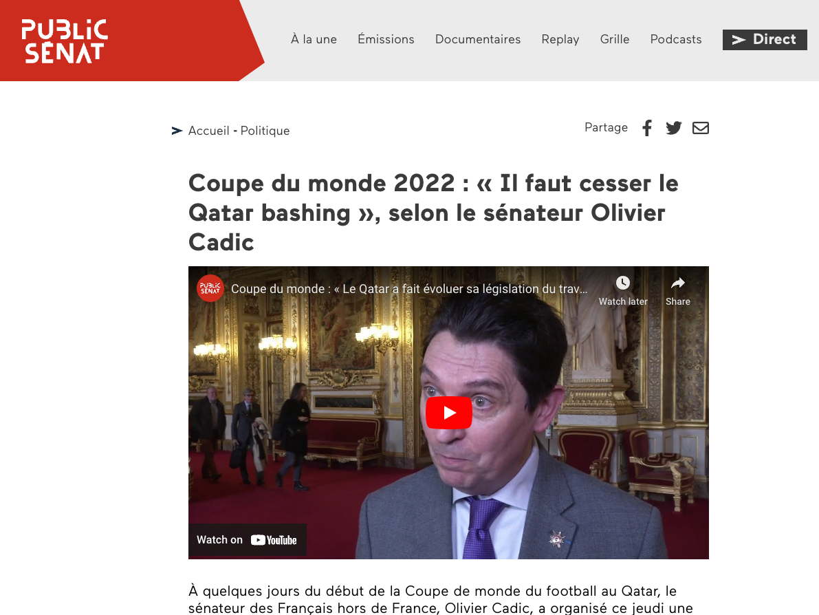 Je remercie Emo Touré de Public Sénat d’avoir assisté à ma conférence de presse et sollicité mon avis sur les polémiques concernant de la Coupe du monde de football au Qatar : législation du travail, droits humains ou écologie