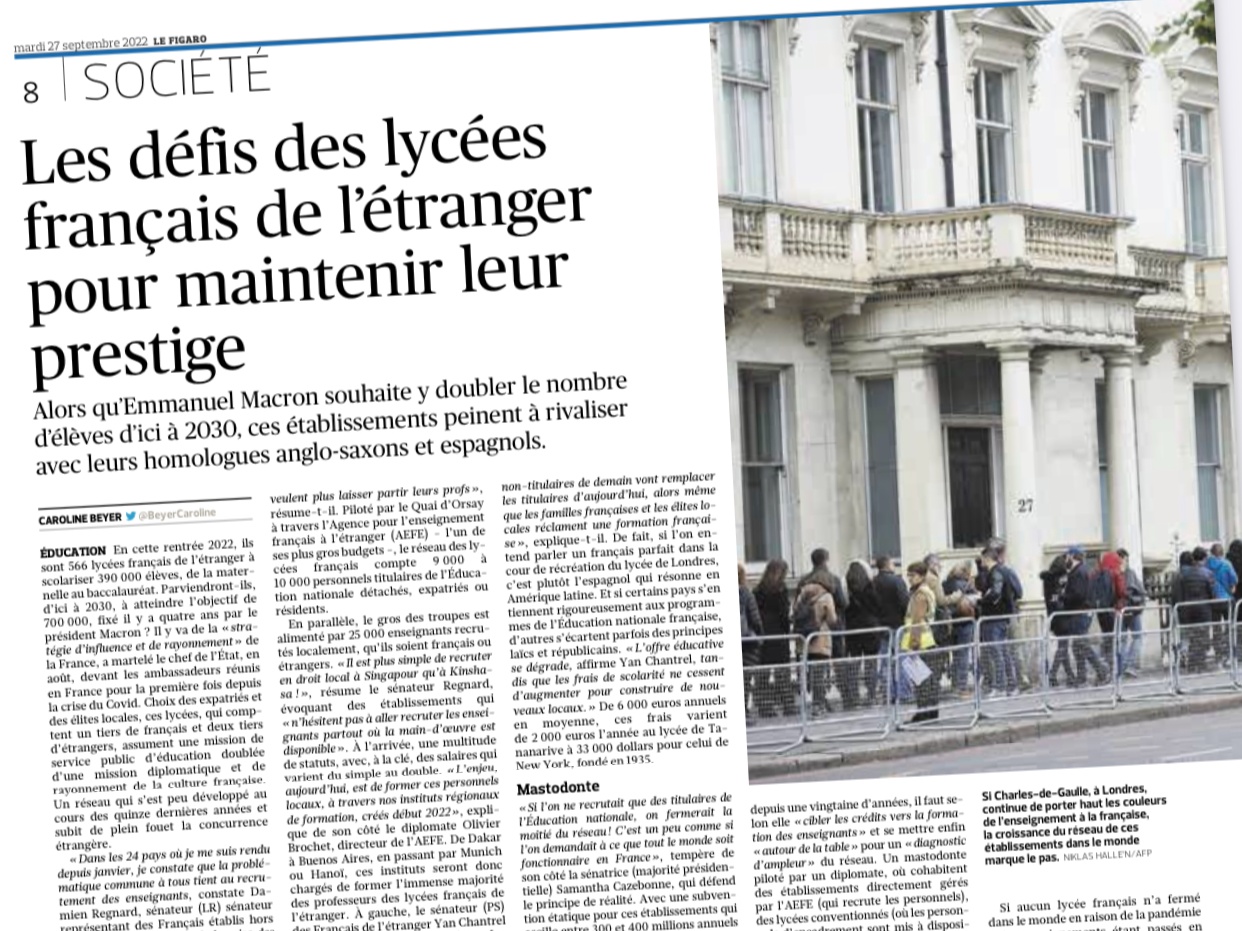 J’ai répondu aux questions de Caroline Beyer, Le Figaro, sur l’avenir du réseau français à l’étranger, de même que mes collègues Samantha Cazebonne, Damien Regnard et Yan Chantrel, mais aussi Olivier Brochet, directeur de l’AEFE.