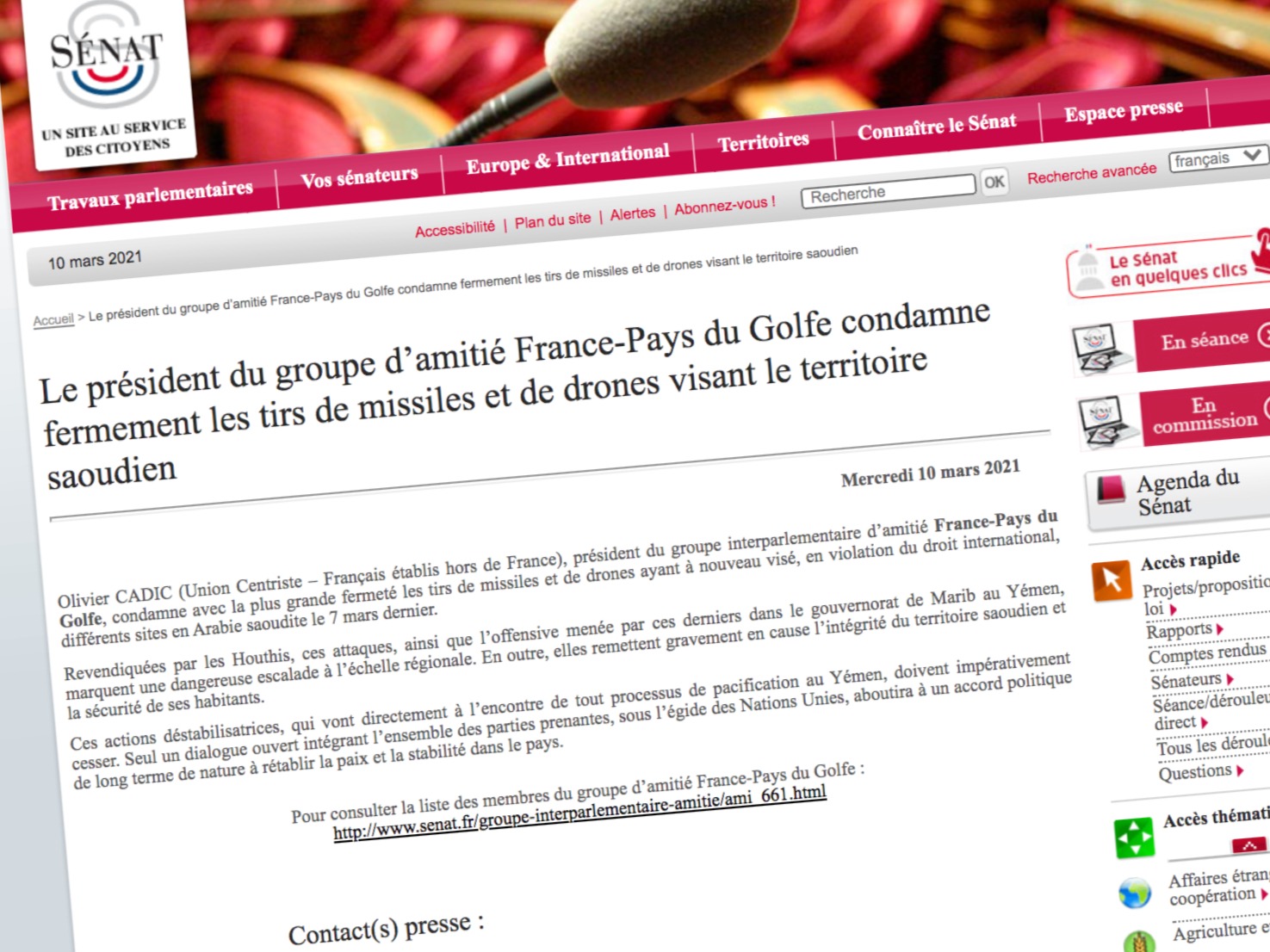 En qualité de président du groupe d’amitié France-Pays du Golfe (*), je condamne avec la plus grande fermeté les tirs de missiles et de drones ayant à nouveau visé, en violation du droit international, différents sites en Arabie saoudite le 7 mars dernier.