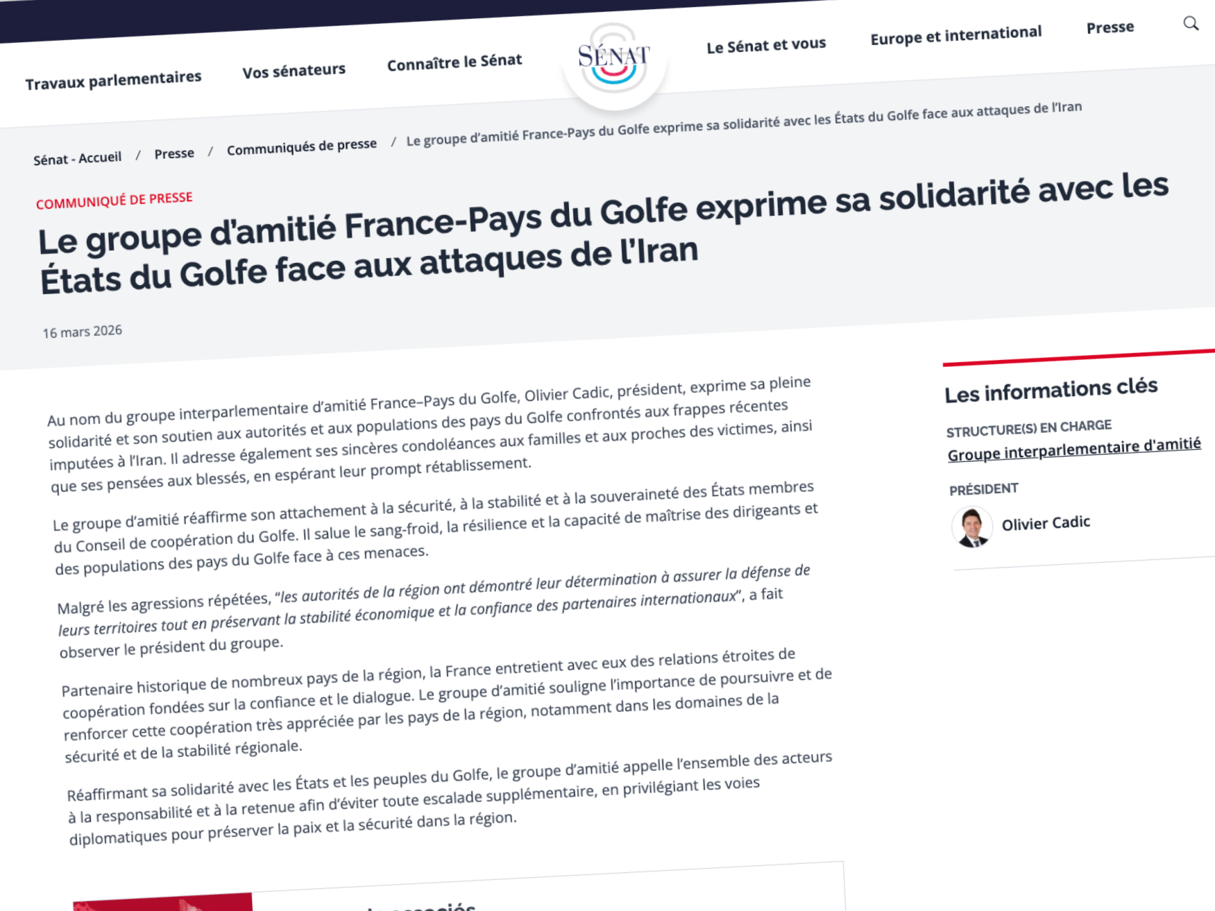 Au nom du groupe interparlementaire d’amitié France–Pays du Golfe, Olivier Cadic, président, exprime sa pleine solidarité et son soutien aux autorités et aux populations des pays du Golfe confrontés aux frappes récentes imputées à l’Iran. Il adresse également ses sincères condoléances aux familles et aux proches des victimes, ainsi que ses pensées aux blessés, en espérant leur prompt rétablissement.