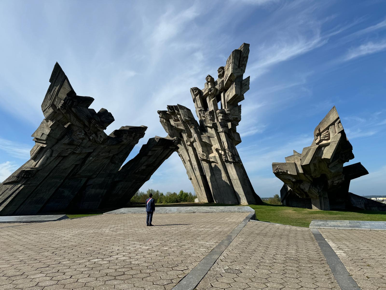 Je me suis recueilli ensuite devant le mémorial aux victimes du fascisme. Œuvre de 32 mètres de haut du sculpteur A. Ambraziunas, la composition sculpturale en béton est structurée en trois parties. La plus petite, à droite proche de la terre, s’appelle “Pain” (douleur), celle en diagonale à gauche est “Espoir”, et la plus grande, décorée de visages souriants, est “Libération”.