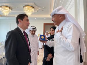 Je remercie so Excellence Sheikh Ali bin Jassim Al-Thani, ambassadeur de l’État du Qatar en France et l’équipe de l’ambassade à Paris, et au ministère des Affaires étrangères du Qatar pour leur invitation à assister aux demi-finales à l’occasion de ce déplacement.
