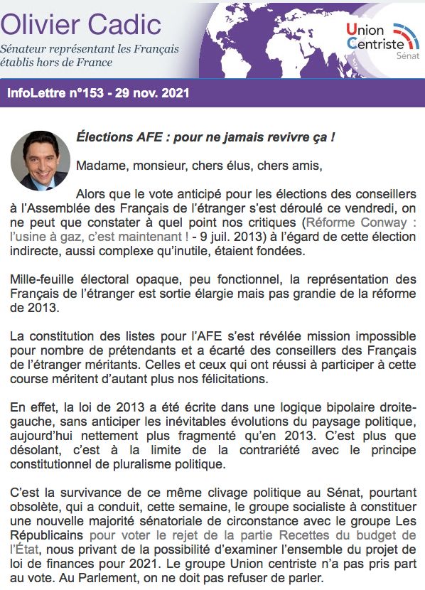 Un seul regret, assorti d’une frustration : que les élus des Français de l’étranger n’aient pu être présents d’une manière ou d’une autre pour saluer le Président de la République, lors de son passage dans chaque pays.
