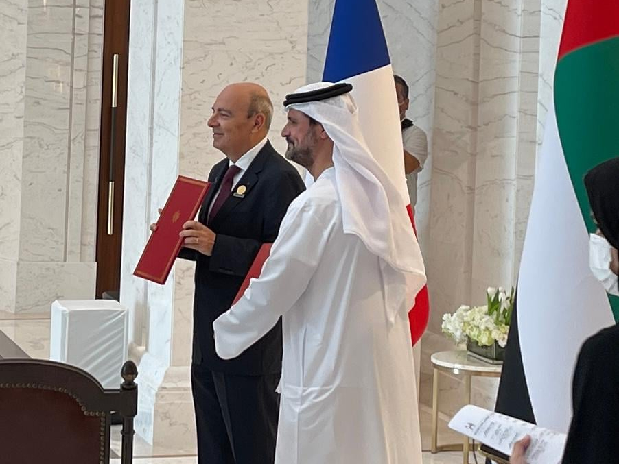 Six heures après avoir posé le pied sur le sol des Émirats, notre délégation s’est acheminée vers le site de l’Exposition universelle pour assister à la signature des accords, en compagnie d’Amélia Lakrafi, députée des Français établis hors de France.